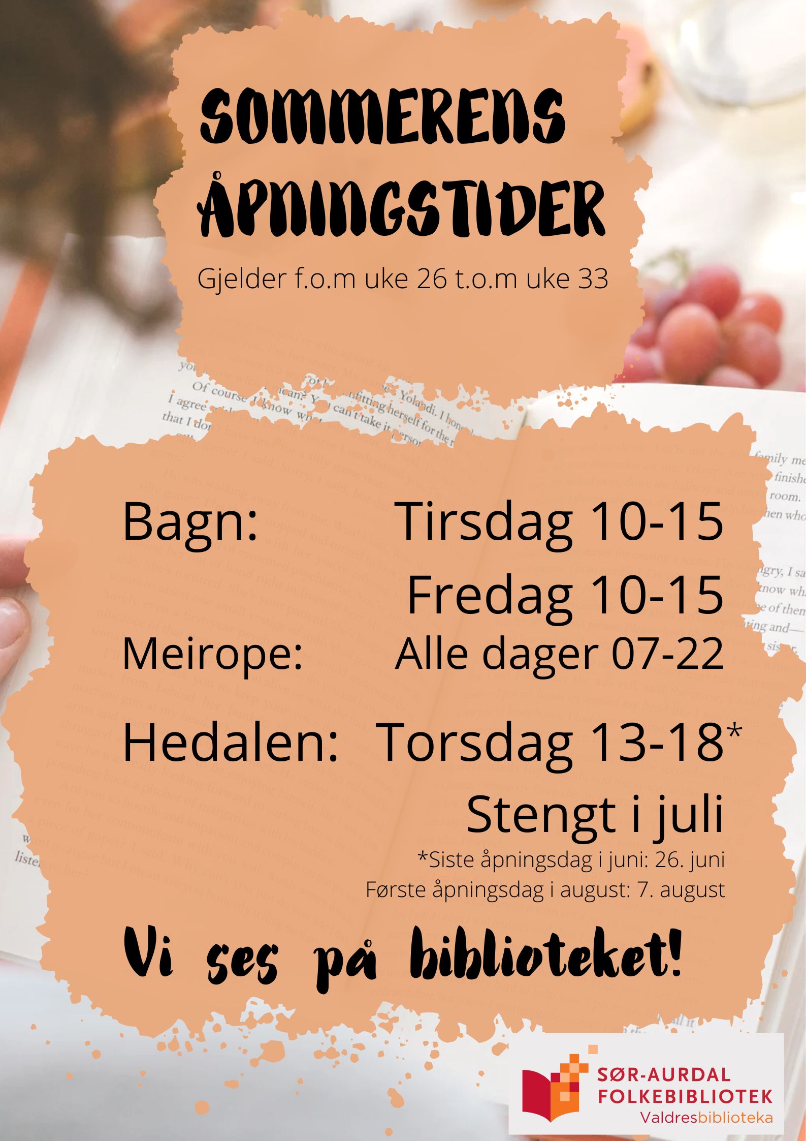 Informasjon om sommarens opningstider på hovudbibliotek, filial og utlevering i Begnadalen.