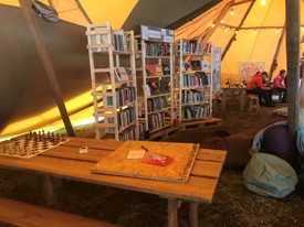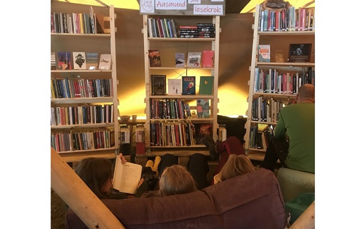 Det var mange bøker som vart lese rundt om i storteltet. 10 bøker vart utlånt og tatt med ut av storteltet, sju av dei kom inn att før vi pakka ned laurdag ettermiddag. Så blir det spennande å sjå når dei tre siste kjem inn att.